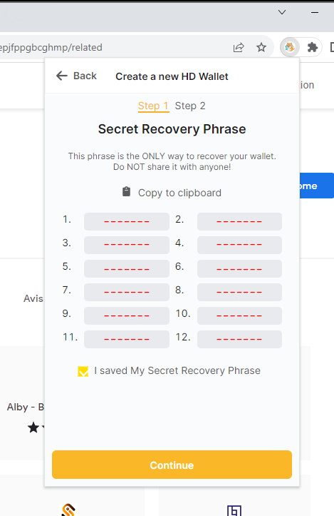 安全地写下您的种子短语后,勾选 "I have saved my Secret Recovery Phrase"并点击 "Continue"。
