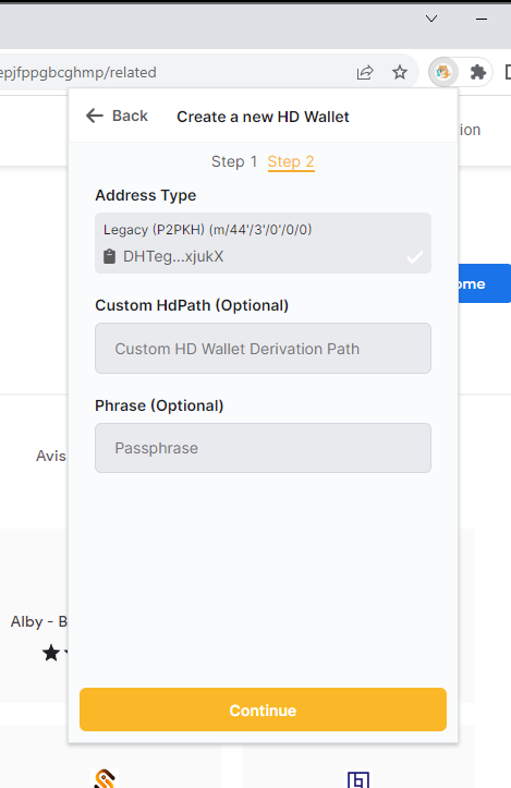只需点击"Continue"。无需填写“Custom HdPath”和“Phrase”字段。