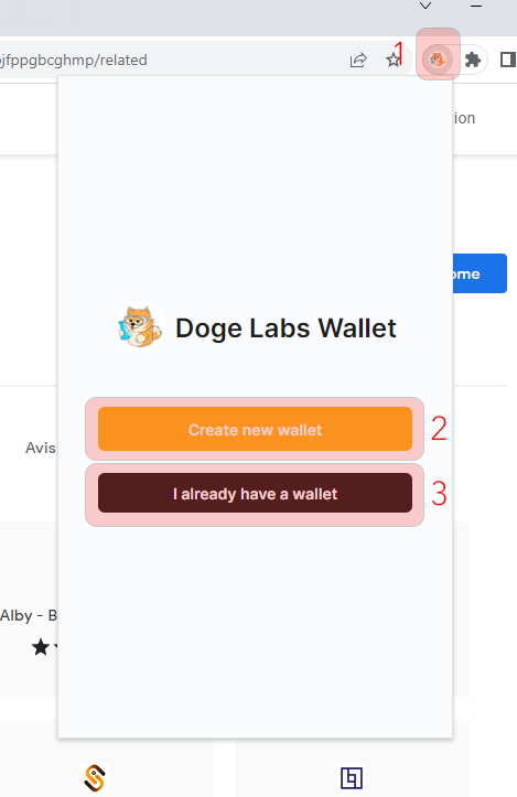成功安装 DogeLabs 钱包扩展后,您可以创建一个新钱包 (2) 或导入现有钱包 (3)。本节将首先介绍如何创建新钱包。如果您已经有一个 DOGE 钱包,只需点击“我已经有一个钱包”并按照指示操作。