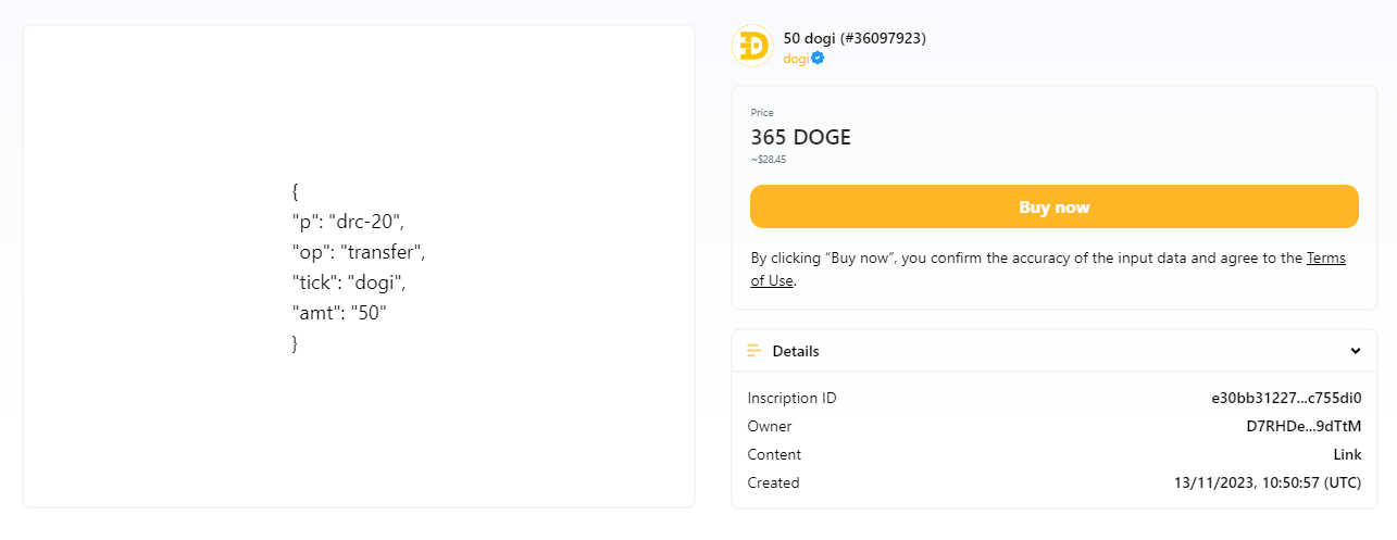 选择您希望购买的资产。 例如,我们将选择在DRC-20上部署的第一个代币,dogiarrow-up-right。